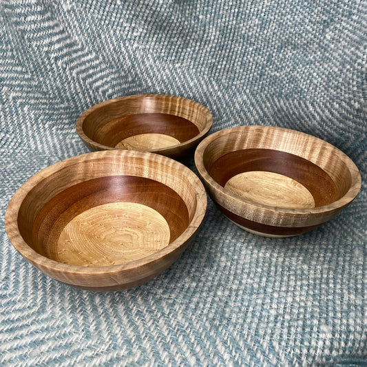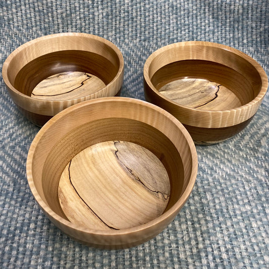 A few years ago, my step-daughter asked if she could mix and match some different wood species for her own bowl. She picked Spalted Maple, Walnut, and Curly Maple. The finished bowl was so beautiful that I made it my first series, which bears her name.